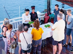 Sunset on Ha Long Bay with fruits and biscuits, tea, and